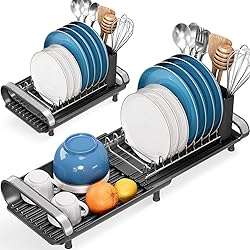 [ EXTENDABLE DESIGN ] This dish rack is extendable to hold more items, and fold up to save space. It's suitable for different kitchen countertop surface. Dimensions:11"-19.3"L×7.7"W×3.54"H. When not in use, it can be folded up for convenient storage in a drawer [ PREMIUM QUALITY ] Plate rack & handles are made of food-safe stainless steel, remains dish drainer rust-free after long term use. Match with eco-friendly plastic and non-slip rubber feet preventing surface scratching and adding stability [ COMPACT DESIGN ] This dish drying rack holds up to 9 plates, several glassware,cups, bowls etc. With compact design, it’s perfect for limited counter space, small kitchen, a couples, apartments or dorms [ REMOVABLE UTENSILS HOLDER ] It features a detachable 2-slot cutlery holder with drainage holes to keep your utensils dry and clean. With snap-on recessed lock at bottom, the utensils holder can stand stably even when putting more silverwares [ QUICK DRAINAGE SYSTEM ] With TOOFL kitchen drainer, plates are held neat and upright for quick drying. Angled draining board has raised ribs to direct water straightly into the sink. Set free from drying dishes tediously by hand