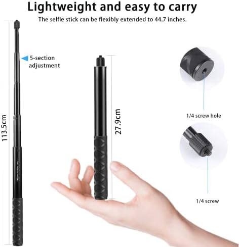 - Gran compatibilidad: el palo para selfies adopta un tornillo estándar de 1/4 de pulgada y un adaptador de montaje para cámara de acción, adecuado para GoPro Hero 11/10/9/8 Insta360 ONE X/ONE/EVO.