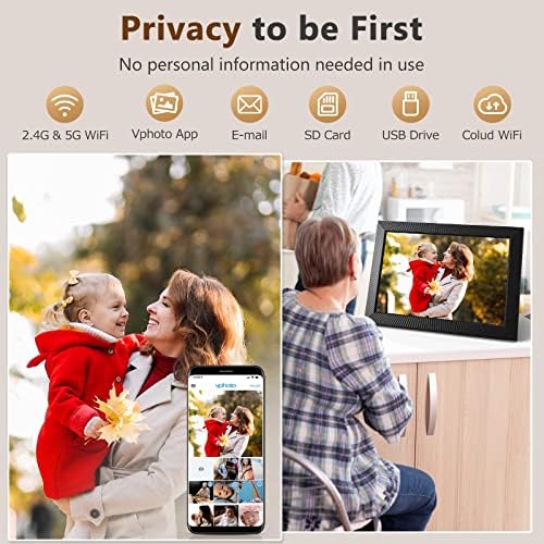 - [Share Privately and Securely With Your Family] Our free “VPHOTO” App does not collect any personal information when in use, so you don’t have to worry about your privacy being exposed. Plus, you can invite your family to connect to your photo and video sharing frame, creating a private family sharing network. This digital photo frame supports 2.4Ghz/5GhZ Wi-Fi to share photos and videos directly to the digital photo frame via the VPhoto app/Email.