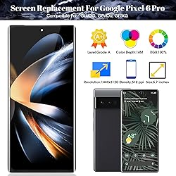 - Our Screen Is High Quality LCD Display Touch Screen Digitizer Assembly Replacement with frame For Google Pixel 6 ProProduct Description:-Metarial: OLED-Model: GLUOG, G8VOU,GF5KQ-Size: 6.7 inches-Resolution: 1440 x 3120 pixels-Suitable For: For Google Pixel 6 Pro LCD Display Touch Screen Digitizer Assembly Replacement with frame-Package Including:1x LCD Touch Screen Assembly Replacement1x Free Double-sides Adhesive Tape1x a set of install kitsInstallation Precautions:1. Check whether the product is in good condition and test it before installation. Do not remove protective film or labels during testing. Watch out for static issues.2. The screen is glass, which is a very fragile product. Testing before installation is strongly recommended3. Do not bend the cable. During installation and testing, make sure the LCD cable is not bent. 4. If your phone has a black screen during installation, press and hold the power key and volume key at the same time. If the phone vibrates, it's because the mainline is not installed properly. Then reinstall the product.5. If you are not professional in maintenance, or have no experience in repairing electronic equipment, we do not recommend you to replace the screen by yourself. Take it to a repair shop for help to save you time and money. Or find the relevant installation video on the YouTube platform and follow the installation steps to install.