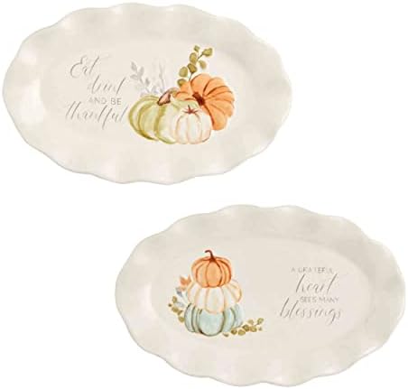 A grateful heart sees many blessings with our Thankful Sentiment Plate. The plate features an oval shape. The plate is made of dolomite. The ceramic oval plate features a ruffle edge. The plate features a pumpkin image. The plate features the sentiment "Eat, drink and be thankful". The plate is dishwasher safe. The plate measures 8" x 5". This is so great for Friendsgiving.
