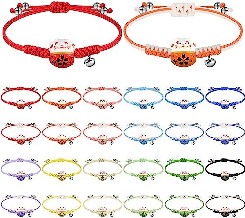 Kigeli 24 Pcs Lucky Cat Bracelets Cute Maneki Neko Adjustable Fortune String Feng Shui Bracelet Ceramic Lucky Cat with Bell for Women