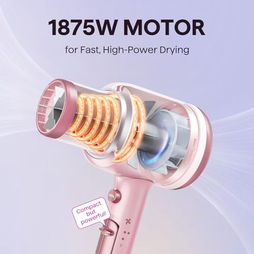 • 2x Faster Drying: Powered by a robust 1875W motor and advanced aerodynamic design, this ionic hair dryer delivers high-speed airflow to dry your hair twice as fast. Spend less time drying, avoid overheating, and minimize damage—all while achieving effortlessly sleek results