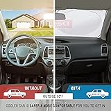 Customizable: The windshield sun shade can be personalized with a design, message, or logo of your choice, making it a distinctive and personalized accessory for your vehicle Premium Materials: The outside of the sun shade is made of premium polyester, while the inside is lined with a silver-coated blackout cloth (polyester). This combination of materials provides extra sun protection and helps to keep the car interior cool and comfortable Effective Sun Protection: The sun shade is specially designed to provide effective sun protection, preventing the aging of the car interior and reducing the time required for cooling inside the vehicle Durable and Foldable: The sun shade is made with elastic steel that allows it to be folded multiple times without deforming. This makes it easy to store when not in use and helps it to last longer Universal Fit: The sun shade is designed to be compatible with a wide range of cars, SUVs, and trucks, making it a versatile and practical accessory for any vehicle