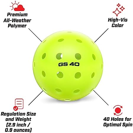 GoSports GS 40 Outdoor Pickleballs are regulation, performance grade balls for tournament level games. The seamless one-piece construction ensures the ball is durable enough for games on outdoor courts to resist cracking, and to maintain performance for countless games. Each hit with the GS 40 Pickleballs achieves optimal spin and flight thanks to the 40 precision, machine drilled holes and results in a reliable and consistent bounce. The high visibility color makes the balls easy to spot during games which makes this an ideal set for beginners and longtime players alike. Now gear up to get out and play the fastest growing sport in America with GoSports GS 40 Outdoor Pickleballs!