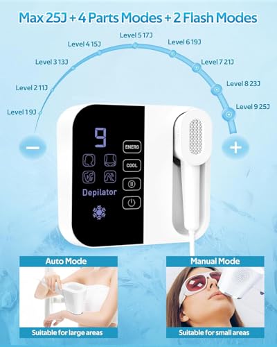 - 😍【4 Areas of Customisation】The hair removal device offers exclusive customisation for four areas of the face, arms, legs and bikini line, plus 9 cyclically adjustable energy intensity levels with manual and automatic flash modes to cater for different sized hair removal areas, making the entire hair removal treatment convenient. Save time and money with salon-level treatments at home.