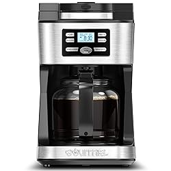 - A good day starts with the perfect cup of coffee. You need a coffee maker that’s as flexible as you are, and this Gourmia 12-Cup Programmable Grind & Brew Coffee Maker is up to the task. When you just need a cup of coffee in the morning, the last thing you want to do is pull out the grinder and blitz your beans to the right size. This Grind and Brew Coffee Maker with built-in grinder is here to make your mornings, days, and nights easier. The integrated grinder, with adjustable grind size, produces uniform size grinds while maintaining the flavor and aroma of the beans to make for the perfect cup of coffee. You can also brew your favorite pre-ground coffee, with the Grind Off Feature. Its easy-read display makes it easy to program, and the adjustable 4-hour keep-warm ensures hot coffee is ready when you are. The water window provides convenient water level monitoring. Features a sleek, durable, and modern design, with stainless steel accents, and 12-cup glass carafe. With the Gourmia Grind & Brew Coffee Maker with built-in grinder, save time and space and enjoy consistently fresh and delicious coffee, cup after cup. Additional features: Pause & Serve Remove carafe to enjoy a cup before brewing is completed Auto Shut Off For safe, stress-free usage Easy-Read Display Large time for easy viewing and programming Water Window Provides convenient water level monitoring Sleek & Durable Modern design with stainless steel accents, and 12-cup glass carafe Includes Dishwasher Safe: • Reusable Filter • Removable Funnel • 12-Cup Carafe • Scoop Enjoy the daily grind!
