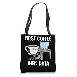First Coffee Then Data First Coffee Then Data fashion perfect for a Data Scientist, Data Analyst or someone who works with computers. 16” x 16” bag with two 14” long and 1” wide black cotton webbing strap handles. Made of a lightweight, spun polyester canvas-like fabric. All seams and stress points are double-stitched for durability, and the reinforced bottom flattens to fit more items and hold larger objects. Spot clean/dry clean only.