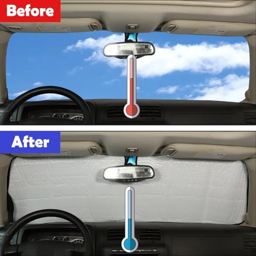 - 【Superior Sun Protection】 Sun Shield for Car offers outstanding automotive interior sun protection, is made from reflective aluminum foil combine with double layer bubble material,The reflective material will blocks sunlight and heat, not only effectively reduce automobile internal temperature, the fuel consumption saving air conditioning, also prevents fading and cracking the center console accessories, your car's interior temperature will stay at an optimum level!