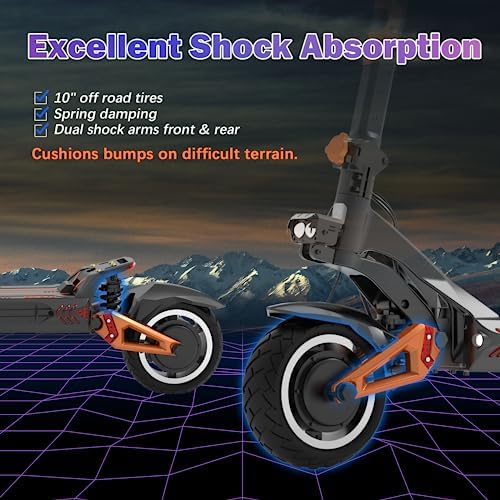 - Comfortable Ride : KUGOO Kirin G3Pro dual-wheel drive electric scooter features carefully tuned damping spring shock absorbers to effectively cushion bumps from complex terrain, and with 10-inch off-road tires and dual front and rear shock-absorbing arms, you can drive it on rugged surfaces to make the most of your fun.