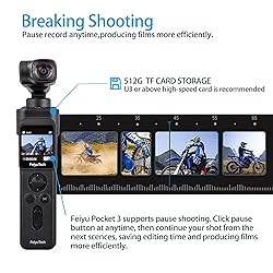 - Feiyu Pocket 3 4K UHD 3-Axis Handheld Gimbal Camera Combo Kit with Remote Handle, Tripod, Magnetic Mount, 130° Wide-Angle Lens, Face Tracking – Black Take your creativity anywhere with the Feiyu Pocket 3 — a compact, versatile 3-axis handheld gimbal camera that fits in your palm but delivers professional-grade stabilization and imaging. Designed for vloggers, travelers, and content creators on the go, the Pocket 3 features a powerful 1/2.5" 12MP CMOS sensor that captures vivid 4K video and high-resolution stills. The 130° ultra-wide-angle lens supports wide, ultra-wide, and narrow-angle shooting modes, while the integrated gimbal ensures stable shots on rough terrain or high-speed action scenes. With the detachable remote handle, enjoy wireless control and live video monitoring — ideal for creative setups and dynamic filming scenarios. The magnetic base allows for hands-free mounting on metal surfaces, and the entire system is easily controlled via the Feiyu Cam app on your smartphone. Included in the bundle are essential accessories like a tripod, wristbands, USB-C cable, and protective case — everything you need for your next shoot.
