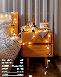 - JOLYMOLY globe string lights 59 ft 100 LED fairy lights plug in with remote timer extendable twinkle lights for living room bedroom wedding patio porch Halloween Christmas indoor outdoor decor, warm white Spicing up your home with these cute JOLYMOLY globe string lights. These string lights create a warm and lovely atmosphere. The soft white glow is pretty and adds a real aesthetic to your room or outdoor space. 59 feet is a perfect size and it has 10 feet of leads so you can find a decent plug before you string them along. The 8 different lighting settings are also pretty cool. Specifications Light Source: LED Number of Lights: 100 String Length: 49 ft Cord Length: 10 ft Power Source: Corded electric Input Voltage: 120 V Rated: 6 W