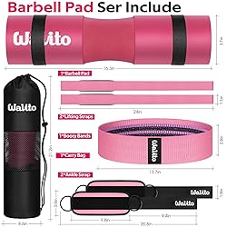 - WALITO Barbell Squat Pad Set -- Push Yourself Beyond The Limits!① Relieve pressure and discomfort from deep squats.② Give the safest protection for the neck and shoulder.③ Sweat-absorbed Oxford fabric is soft for the skin.④ Thick enough for the pad to relieve stress and pain significantly.⑤ Very convenient for carry, and no more worry about waiting for pads in the gym.Fitness Gym Ankle Straps for Cable Machine---Thoughtful Design & Adjustable: Made of Rugged & durable nylon material. Velcro forms switch design easy to put on/take off.---Double D-rings: Made of strong metal material, complete closure D-rings are designed to make sure you're safe while exercising. It can easily connect to a cable machine and resistance trainer.---USES: Used with Cable Systems, Resistance trainers, Functional Trainer, etc. Perfect for Leg Extensions, Leg Curls, and Hip Abductors.Wrist Straps for Weightlifting---The weight lifting straps are lengthened & non-slip resistance that will give you a superior grip.---6mm extra thick neoprene material to protect your hands from any injuries that might occur while lifting.---Nylon strap to make sure your workouts are comfortable and your wrist aren’t susceptible to any scratches.Booty Resistance Bands for Working Out---Multi-function workout, exercise bands can exercise all parts of the buttocks, arm and leg muscles, abdomen, etc. INCLUDE:Barbell Squat Pad x 1Ankle Straps x 2Booty Resistance Bands x 1Weight Lifting Straps x 2Carrying Bag x 1