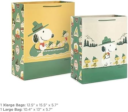 - FUN AND FESTIVE: Pair of fun gift bags feature Snoopy and his yellow bird friends hiking in the woods, roasting marshmallows over a campfire and paddling in a canoe; cord handles complete the look