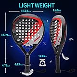 TOP QUALITY: The carbon fiber surface provide high performance for high speed impact hit and response. The EVA Memory Foam Core with new hole distribution, provides a stable better control performance while the hand has a soft feel for long time play. SYMMETRIC CONSTRUCTION:The improved hole drilling technology with hole distribution provide better control and reduce the wind resistance for better speed hit. Symmetrical hole construction provides a great hitting experience. EXTENDED LENGTH: Provide greater leverage on the serve-greater impact and a longer reach and can also improve the efficiency of retrieving a shot when running. ROUND SHAPE: The round shape design provides balance for defensive offense and defense performance. DIMENSION: Padel Thick: 1.46 inch.Weight: 360g-370g.Suitable for beginner to advanced players