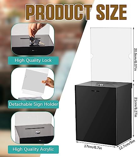 Features: Easy to carry: The acrylic ballot boxes are not too heavy, allowing people to use them when they are out, and it is easy for them to move the boxes as they want, convenient to use. Black color: The donation jar with lock comes with black color, people can't see what is inside, which can make the stuff inside safe, and the black color can make the box obvious, easy to find it. Specifications: Main material: acrylicColor: Donation boxes: blackSign holder: clearSize: Donation boxes: about 8.2 x 6.7 x 5 inches/ 21 x 17 x 12.7 cmSign holder: about 8.1 x 6.7 inches/ 20.5 x 17 cmPackage includes: 2 x Donation boxesNotes: Manual measurement, please allow slight errors on size. The color may exist a slight difference due to different screen displays.