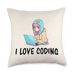 100% Polyester This programmer design features a kawaii and cute anime programmer and reads 'I Love Coding'. 100% spun-polyester fabric Double-sided print Filled with 100% polyester and sewn closed Individually cut and sewn by hand Spot clean/dry clean only