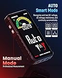Auto & Manual Mode: The KM602 digital multimeter features a SMART mode that automatically measures voltage, resistance, and continuity. It identifies what you're testing and selects the optimal range for precise and quick measurements. In manual mode, it accurately measures AC/DC voltage, resistance, continuity, current, capacitance, frequency, diodes, duty cycle, temperature, NCV, and live wires Rechargeable & Convenience: With a built-in rechargeable 1200 mAh battery, this smart multimeter allowing for extended use without frequent battery changes. It comes with Min/Max/Average recording for signal fluctuations, an analog bar display; real-time temperature display; low battery alerts; data hold for added convenience Full-Screen & Easy Reading: The 6000 Counts TRMS multimeter tester boasts a large full-screen display and a built-in flashlight. The expansive color screen ensures clear visibility of measurements, even in low-light conditions, while the flashlight helps you work in dark or hard-to-reach areas, making it a versatile tool for any environment Safety First: The KAIWEETS multimeter prioritizes your safety with its IEC CAT.III 1000V and CAT.IV 600V ratings. It’s equipped with double fuse anti-burn and overload protection, ensuring maximum safety during use. CE and RoHS certifications further guarantee its reliability, making it a secure choice for automotive, industrial, and household electrical diagnostics Sincere Services: KAIWEETS offers 3 years of after-sale service and lifetime technical support. Feel free to reach out with any questions. The package includes a multimeter, test leads, charging cable, thermocouples, batteries, user manual, and storage case.