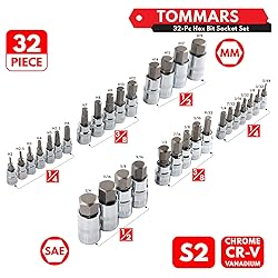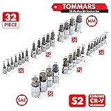 TOMMARS 32-PC Master Allen Hex Bit Socket Set, SAE & Metric Allen Hex Key Wrench Socket Set S2 Steel 1/4", 3/8", 1/2" Drive, H5/64 - H3/4 & H2 - H19