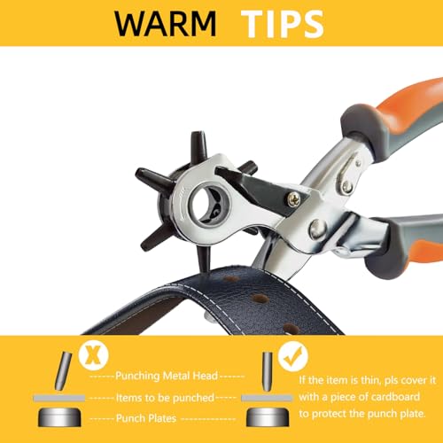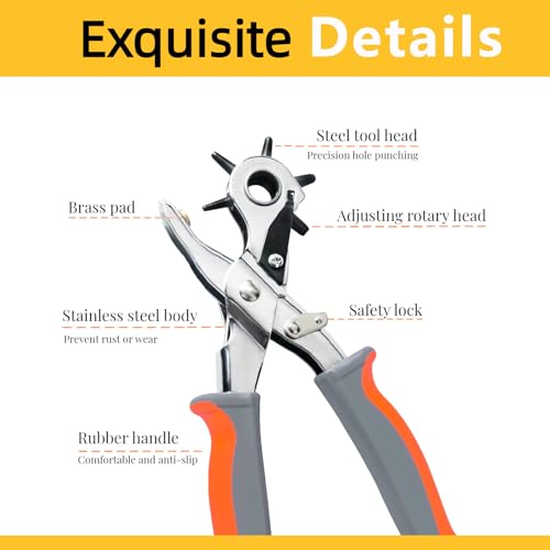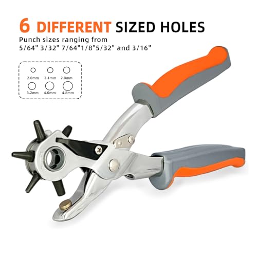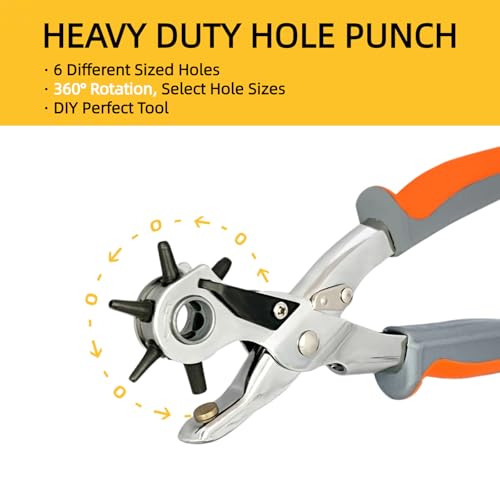 - 【Effortless to Use】: No extra tools required—this revolving belt punch simplifies hole-drilling. Just rotate the head to your desired size, place the material into the hole puncher, squeeze the handles, and get a hole in seconds.