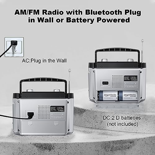 AM FM Radio with Best Reception, Bluetooth Stereo Sound Speaker Portable Radio, Battery Operated or Plug in Wall with Headphone Jack, AUX, Large Tuning Knob for Kitchen, Camping Sliver