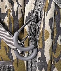 Brown rain cover included for weather protection. Zipperless lid design for quiet access Large main compartment for gear storage. Interior mesh pocket for organizing gear. Two fabric & mesh side pockets. Two-piece adjustable and removeable waist belt. Two waist belt pockets w/ silent zippers Dual accessory side straps to secure gear and weapons. Flip down lid with pockets for easy access to gear when in the stand or blind. Chest & waist straps 100% poly brush/soft/durable/quiet material Original MO Bottomland Camo