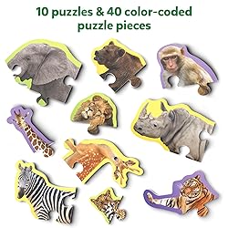 10 COLOR-CODED PUZZLES: This set includes 10 color-coded wild animal puzzles that progress in complexity. Start with the 3-piece puzzles and progressively work up to 4-piece and finally the 5-piece puzzles. Each type of puzzle is color-coded so it's easy to sort. As young children master their puzzling skills, they'll learn about wild animals and build confidence along the way. STAGE-BASED LEARNING: Designed for progressive learning, this puzzle set introduces children to different levels of complexity. They can begin by sorting the puzzle pieces by color and then progress to 3-piece, 4-piece, and 5-piece puzzles. INCLUDES: 10 Animal Puzzles with 40 Color-Coded Puzzle Pieces and Instruction Manual REALISTIC IMAGERY: Once completed, the puzzles showcase vibrant and realistic imagery of 10 popular wild animals and provide an opportunity to learn more about these important animals. HIGH-QUALITY CONSTRUCTION: Made from thick and durable paperboard, these puzzles are built to withstand repeated use for long-lasting enjoyment. BUILDS CONFIDENCE: The stage-based learning design promotes confidence as children progress through the puzzles, providing a sense of achievement at each stage. GREAT GIFT: Skillmatics' Step by Step Puzzles make a perfect gift for birthdays, holidays, or any special occasion. This puzzle set is thoughtful and educational, suitable for children ages 3 and up. DEVELOPMENTAL BENEFITS: Engaging in puzzle-solving activities helps children enhance their fine motor skills, hand-eye coordination, spatial awareness, and cognitive abilities in a fun and interactive way.