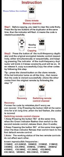 - Door opener,some remote control has a smaller transmitting power,so the original remote control should be placed back to the copy remote control to be operated.for the presence of noise,it should avoid interference to operate,if the copy is not successful,it should recopy after clearing code.(Attention:your original remote control must be able to work and the same as our remote control frequency).before use it,please be sure to clear the existing code of the self-copying remote control.