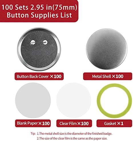 - 🍒2.95" (approx. 3 inch) Button Making Parts List - You will get 100 sets of metal shells, metal button back cover, clear film and blank paper. 75mm mental button parts supplies include an extra gasket to be placed in the button back cover's recess before assembly.