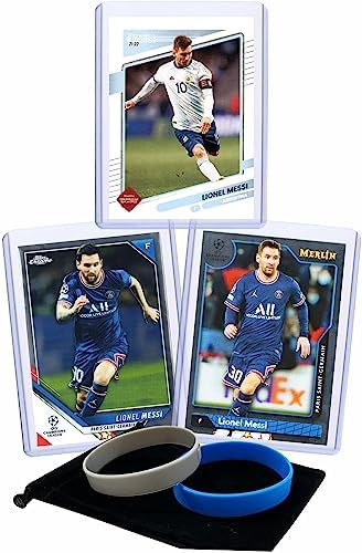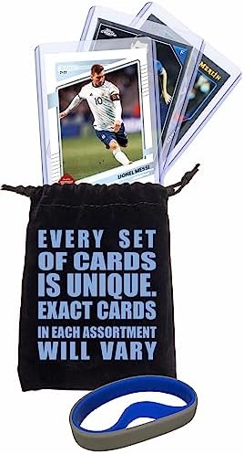 Hazte con este fantástico lote de uno de los mejores jugadores de fútbol de todos los tiempos. Se garantiza que contiene 3 tarjetas coleccionables de fútbol auténticas y con licencia o pegatinas de Lionel Messi. El surtido exacto varía y puede contener una mezcla de uniformes del equipo actual y anterior. Cada tarjeta viene en una funda protectora y en una funda de carga superior. El grupo viene en una bolsa de regalo con pulseras de varios colores. Ideal para regalar a coleccionistas jóvenes y mayores.