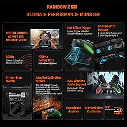 【Multi-platform Gaming Controllers】Wireless PC controller Rainbow 2 Pro works for Switch, Windows10&11, Android7.0+, iOS14.0+. One click to wake up Switch. PC game controllers are designed with 2 custom back buttons, 2 top buttons, Hall-effect triggers, ALPS joystick, dual motor, motion aiming, Turbo, Marco, built-in Bluetooth, RGB lighting, ELITE App.【Audio Support】RAINBOW 2 Pro supports the 3.5mm audio jack function when 2.4G connection. Support game of Black Myth: Wukong. 【2.4G USB & Bluetooth & Wired Connections】Wireless gaming controller assists you in playing games with ease via 2.4G wireless dongle, Bluetooth or a USB cable connecting to various consoles, providing extremely reliable signals and connection without any interference and also helping play games more freely and flexibly compared with other game controllers. 【Ultra-high Polling Rate】2.4G wireless polling rate: 200Hz, wired polling rate: 1000Hz. 【Motion Control】"GYROCON+" technology of PC gaming controller supports motion aiming games on PC. Please do not turn on Motion Aiming function on Switch. Switch supports native motion control. 【4 On-board Profiles】Wireless game controllers bring your settings anywhere and be ready for any types of games with the Rainbow 2 Pro. 【ALPS Joystick】0 deadzone joystick of Switch Pro controller provides accurate more aiming miraculous moving. 12-bit chip & 2000+ resolution of joystick operate games more smoothly. Adaptive calibration will check the center points and kill the drift.【Hall-effect Trigger】Hall trigger liner trigger provides precise control for racing, quick fire, short pull for shooting games like APEX, long pull for racing games like Forza Horizon 5. 【Customize Back Buttons】2 Back buttons & 2 top additional buttons pc controllers for gaming provide the function of Macro, Turbo, and Remapping the buttons. 【Dual Motor Vibration】Computer controller gives you immersive gaming experience. 4 levels of vibration intensity can be adjusted. 【BIGBIG WON ELITE APP】Rainbow 2 Pro Bluetooth controller supports APP real-time customizing and quick setting. You can easily adjust the RGB, motion control, joystick, trigger, buttons, and MACRO. ELITE APP is available on Apple App Store / Google Play. 【RGB Lighting】RGB effects of controller for Switch can be set via the App, making the gaming atmosphere more exciting.【Package Contents】1*BIGBIG WON Rainbow 2 Pro wireless controller, 1*2.4G USB dongle, 1*type-c cable, 1*user manual. 【Note】When wired connection, to connect Switch, please firstly enable the option of "System Settings">"Controllers and Sensors">"Pro Controller Wired Communication". To work on Steam, please tick “Xbox Configuration Support” in the “Settings-Controller-General Controller Settings” of Steam.***"Rainbow 2 Pro" does NOT have 8-way D-pad & 3 sets of joysticks & charging dock. Only "Rainbow 2 Pro with charging dock" is packaged with those. ***R90 does not work with Rainbow 2 Pro controller. 【Joysticks & Triggers Calibration】When joysticks drift seriously, or can’t be pushed to the maximum; when triggers automatically send a key value, or can’t reach the maximum linear value, please calibrate the joysticks & triggers. 【Reset】Long press “HOME” button for 10s.
