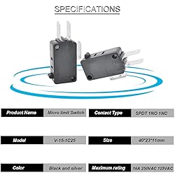 - Product Description Specification: Style:No Hinge Product Name :Micro limit Switch Color: black and silver Model: V-15-1C25 Contact Type:SPDT 1NO 1NC , Actuator TypePush Button Max. Rating: DC 0.6A 125V DC 0.3A 250V AC 16A 125V/250V Switch Body Size(Each):4 x 2.3 x1.1cm/1.6inch x 0.9inch x 0.43inch(L*W*T) Fixing Holes Diameter:3.5mm / 0.14inch Button Height: 0. 3cm / 0. 12inch Material: Plastic, Metal Package Includes: 15 x V-15-1C25 Limit Switch