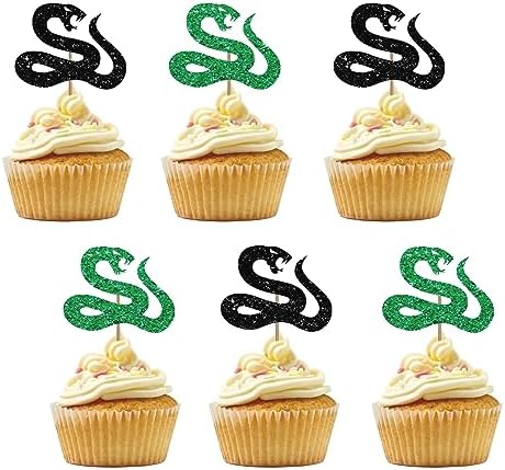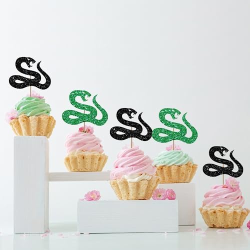 Set of 24 Snake Cupcake Toppers for Reptile Pet Theme Party, Black & Green Glitter Snake Sign Cupcake Toppers, Cake Decorations for 1st Birthday/Animal Theme Party Supplies