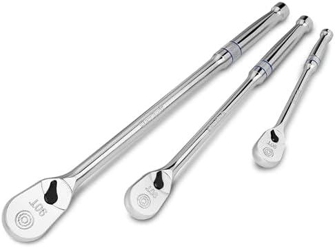 - PREMIUM CHROME VANADIUM STEEL & FULL POLISHED EXTRA LONG HANDLE: This 3-piece 90-Tooth ratchet set offers 1/4 inch, 3/8 inch and 1/2 inch drive. Ratchet is made of high quality chrome vanadium steel for strength and durability. Bright, full polish chrome finish wipes clean easily and ensures durability and corrosion resistance. Smooth comfort-grip handle permits all-day use without gloves. Extra long handle is specially designed for tiny, compact and narrow working environments