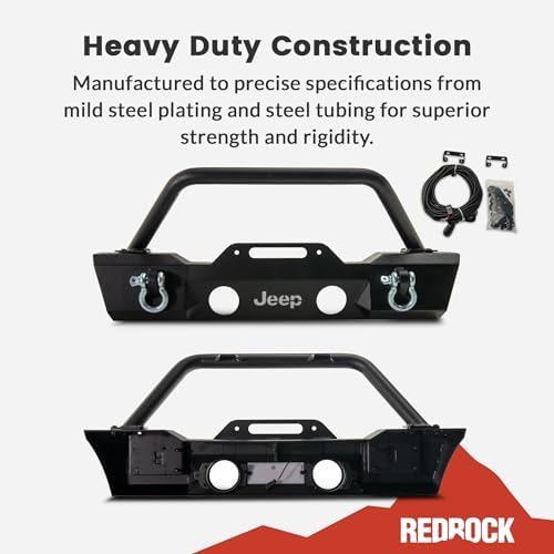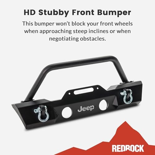 - Heavy Duty Construction Our HD Stubby Front Bumper is crafted from 5/32-inch thick mild steel plating and 2 x 0.120-inch tubing for exceptional strength and durability. It undergoes a meticulous two-stage finishing process, starting with epoxy pre-coating and ending with high-grade textured black powder coating. The D-Ring mounts are welded both internally and externally for added reinforcement. Plus, it features an officially licensed Jeep logo embossed on the front for added style.