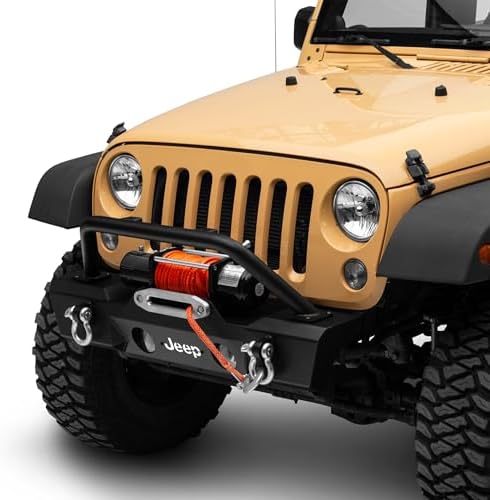 - Ideal for Off-Road Adventures Engineered specifically for the adventurous off-roader, the HD Stubby Front Bumper is compatible with 2007-2018 Jeep Wrangler JK. Showing off an integrated grille guard hoop, our bumper is equipped with two robust D-Ring mounts featuring 9,500 lb. This also includes a convenient built-in winch plate designed to accommodate winches with maximum capacity of 12,000 lbs. This feature enhances the functionality of the bumper for seamless off-road adventures.