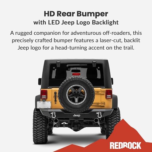 - Ideal for Off-Road Adventures Introducing the Jeep Licensed by RedRock HD Rear Bumper, a rugged companion engineered for the adventurous off-roader. Crafted with precision and attention to detail, this bumper boasts an officially-licensed Jeep logo laser-cut in the center, backlit by LEDs for an eye-catching accent that's sure to turn heads on the trail. Not only does this bumper exude style, but it also offers unparalleled functionality.