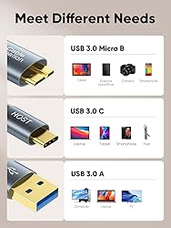 3-in-1 Design:CableCreation USB A/C to Micro B Cable is designed to solve most of the requirement when you want to connect a hard drive to a host device. High-Speed Transfer:Experience fast data transfer speeds of up to 5Gbps with this USB C or USB A to Micro B Cable from CableCreation. You can seamlessly transfer large files, videos, and photos in a matter of seconds. Durable and Stable:Micro B to USB C Cable is made with a cotton braided jacket and gold-plated port. External Hard Drive Cable is built to withstand daily wear and tear, ensuring long-lasting durability Plug and Play:No need to install any drivers! Simply plug in the cable and start transferring files or charging your devices effortlessly Please note:When you use the USB 3.0 A port, please keep the two marked sides connected in the same direction, otherwise only USB 2.0 transfer rate can be reached. You can refer to the image