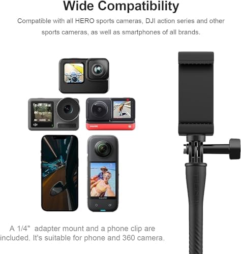 - 【Wide Compatibility】Works for smartphones up to 4.3” wide like iPhone 14/14 Pro/13/13Pro/12/12 Pro /iPhone 11 /11 Pro/ XS/XS Max/XR/8/8 Plus/X/7 Plus/7/6s Plus/6s/6 Plus/6 & Samsung. By a standard ¼ inch adaptor screw thread for Insta360 and built with adapter for GoPro Max, GoPro 11 Mini, Go Pro Hero13 12 11 10 9 8 7 6 5 4, DJI Action 5/4/3, Insta360X4/X3,DJI Osmo Pocket 2 3, Dragon Touch, APEMAN, Crosstour, XiaoYi, Apexcam, VEMONT, AKAIRIO and Sony Nikon Canon Mirrorless SLR DSLR Camera.
