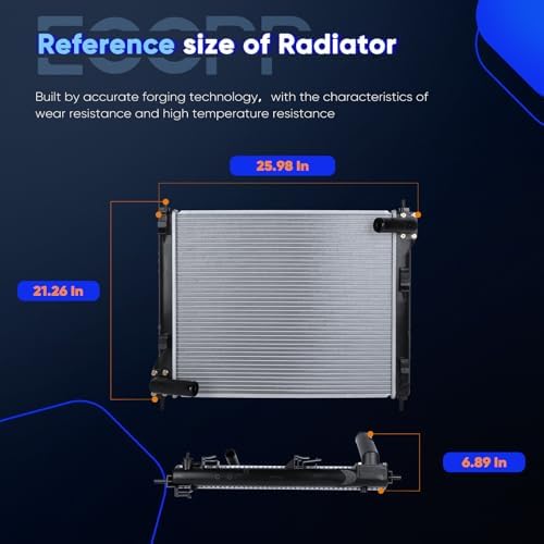 - Premium: The ECCPP radiator is manufactured to the stringent standards to achieve excellent performance, restoring the vehicle's cooling system performance to optimal working condition.Each product undergoes thorough leak inspection; ECCPP premium grade plastic tanks and aluminum cores ensure long-lasting radiator performance.