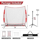 Anti-tear 7-Ply Polyester, Alloy Steel, Fiberglass Masterfully Designed by Baseball Net Specialists 7x7ft Baseball Net & XL Large Ball Collecting System - Featuring dimensions of 7x7ft, this baseball practice net is perfect for practice hitting, pitching, batting, and fielding, offering an expansive catching area. In contrast to other pitching net with smaller pockets, Our softball net comes equipped with an XL large ball collecting system, ensuring all balls stay inside after hitting, allowing you to focus on improving your technique 7-Ply Anti-tear Mesh & Robust Frame - The batting net is constructed with a 7-ply knotless thickened tear-resistant netting, making it highly durable and capable of enduring even the most powerful hits and throws. The high-toughness fiberglass rods provide excellent support, keeping the ball net in shape and preventing it from sagging during intense use. 4 U-shaped sharp ground stakes guarantee easy anchoring on outdoor grass, offering exceptional resistance against strong winds. 5 Minutes Easy Set Up & Portability - Thanks to the quick hook and loop, nylon elastic strap, and Velcro, installing and removing the softball pitching net is a breeze. Instructions are included with the package, and assembly can be done in minutes without any tools. The batting net for baseball attached a carrying bag, which is convenient for long-term storage and carrying. Baseball training equipment with this portable bag, you can have fun with baseball games anytime and anywhere Strike Zone Target & Baseball Batting Tee - This pitching machine includes a sturdy baseball tee with an adjustable height (28 to 44 inches), making it suitable for players of all heights. Its stable tripod design ensures stability during use. The softball tee can work well with various types of balls, such as baseballs, softballs, etc. The pitching net with strike zone target enhances your accuracy and efficiency, instilling the confidence to swing freely All-around Practice Net - This batting cage net is incredibly multi-functional, catering to both individual and team training sessions. You can use it indoors or outdoors, wide-use for various locations such as backyards, sports grounds, garages, or fields. The baseball pitching machines excel in tee work batting sessions, providing an unmatched training experience, improve your skills with this practice net—it's the perfect tool for achieving your goals