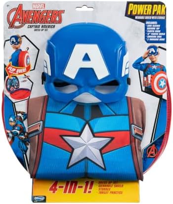 Marvel Captain America Superpower Pak - Backpack with 12-inch Removable Plastic Shield, Throwing Discs, Long Sleeve Costume Top, and Plastic Mask Multi - Youth Medium