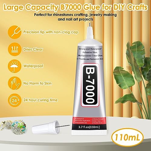 - 【B7000 Glue Clear with Precision Tip】The professional rhinestone glue is designed with a tiny needle tip for easy operation and precise control. Meanwhile, the gem glue for rhinestones has a pin in the cap to ensure sealing so the craft glue won't get dried out or gag and is always ready for use. Full transparency rhinestone glue for crafts dries clear with a clean and gloss finish, the high solid content ensures that the jewelry glue will won’t yellow over time, strong and waterproof (Curling Time: It only takes 3 minutes to dry at room temperature and it can be completely cured in 24-48 hours)