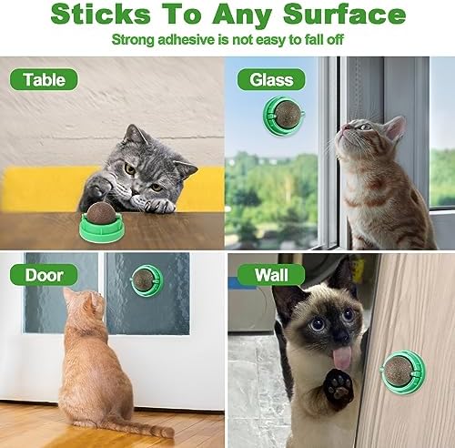 - Unique Design:These catnip toy can easily stick to the wall or other surfaces with strong viscous force, no falling off. And the cat mint ball rotates 360 degrees when your cat licks or plays.