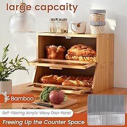 Maximize Your Counter Space:With our bread box, you can clear up clutter and place your baked goods on the table for easy access, freeing up the counter space Dual Door Design for Versatility:The slanted lower door and straight upper door design allows for versatile functionality. You can stack a toaster or other items on top while keeping your bread and baked goods fresh inside Superior Capacity: Our bread box has a super-capacity design, able to hold 2 large loaves of bread, rolls, muffins, and more. You can even use it to store fruits, spices, bowls, and other kitchen utensils Stylish and Functional : Featuring a self-filtering acrylic wavy door panel, our bread box offers a hazy aesthetic, transforming into a splash of interesting colors that won't affect your view of the inside items Keep Your Food Fresh for Longer:Our bread box is designed to keep your food fresh for longer periods. Equipped with tight-sealed doors, your bread and baked goods will stay fresh and tasty for days to come