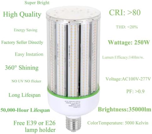 - High Quality: 250W corn light bulb has excellent heat dissipation system including micro fan and aviation aluminum.360°Shining - no dead corner,No flicker ,We have many years of experience in exporting to Europe and America.Factory Sells Directly.We provide a E26 toE39 adapter for each product - just screw in.