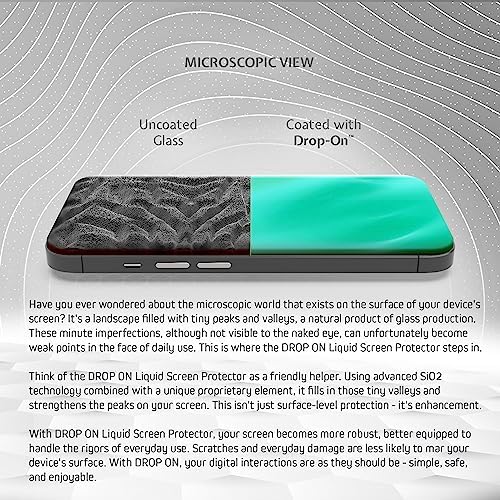- Innovative Protection: DROP ON Liquid Glass Screen Protector brings together advanced SiO2 technology and a unique proprietary component, creating a powerful combination that delivers superior strength, durability, and amplified resistance to scratches and cracks.