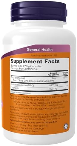 NOW Supplements N-acetyl cysteine (NAC) is a stable form of the non-essential amino acid cysteine. It is a sulfur-containing amino acid that acts as a stabilizer for the formation of protein structures, and promotes the formation of glutathione.* Glutathione is a powerful free radical scavenging compound that also helps to maintain normal, balanced immune system function.* Quercetin is a naturally occurring free radical neutralizer that supports healthy seasonal immune system function.* Laboratory studies have demonstrated that quercetin can also help to promote normal respiratory function.* Zinc has been included for its immune-supporting properties.*