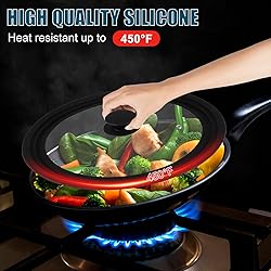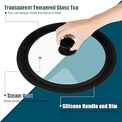 【Versatile and Universal】Introducing our Silicone Lids for Pots and Pans, the perfect solution for all your cookware needs. These universal pan lids are designed to fit 7", 8", 9", 10", 11", and 12" diameter cookware. 【Food Grade Silicone 】The universal pan lid is made from tempered glass and food grade silicone. It provides a safer and stronger alternative to regular glass lids. The silicone outer ring and anti-slip knob are heat-resistant up to 450°F, ensuring durability and reliability. 【Easy To View 】The steam vent hole is strategically placed to release excess moisture and pressure, preventing spillovers and minimizing the loss of moisture during cooking.allows you to conveniently monitor the cooking progress without remove the lid. 【Easy to Use and Clean】Dishwasher safe. Alternatively, you can simply rinse it under running water. The flat design of the lid also saves valuable storage space in your kitchen, making it easy to store and access whenever needed. 【Multi-Purpose Lid】Suitable for skillets, fry pans, saucepans, stock pots, and woks. Keep your kitchen tidy and free from clutter by using this versatile lid on multiple cookware items.