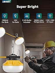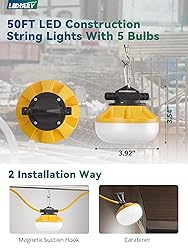 - LEDIARY 50FT LED Construction String Lights, 50W 5000LM String Work Light, Linkable Temporary Lighting For Jobsite, Patio, Indoor, Outdoor-ETL Listed